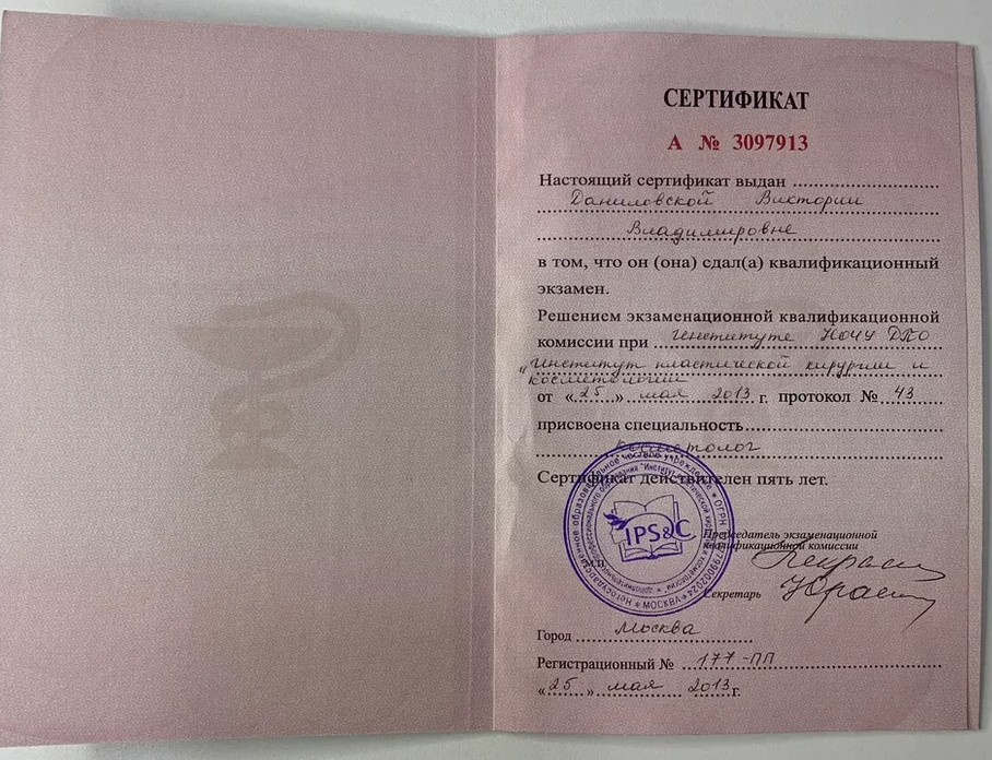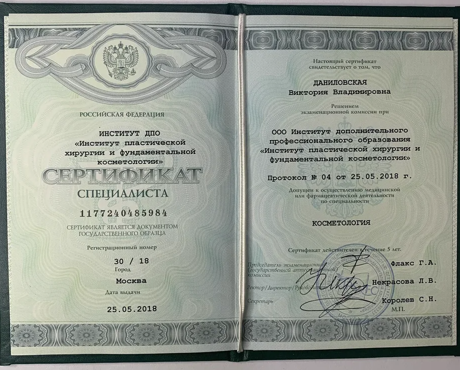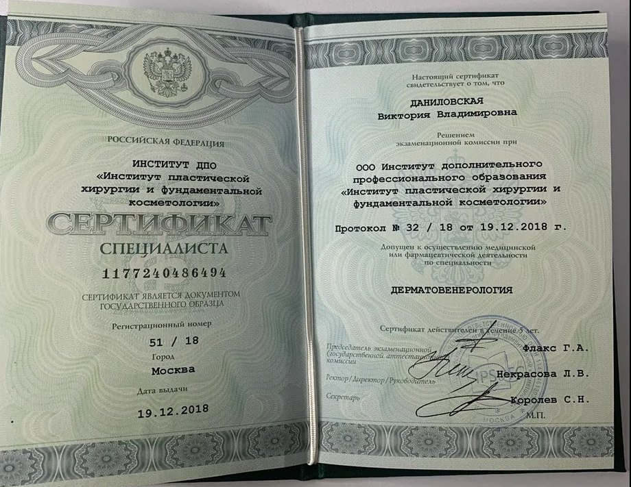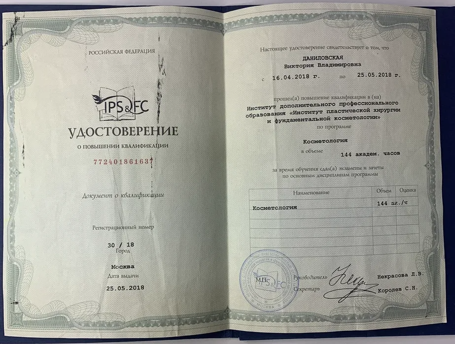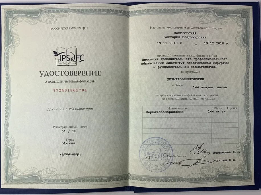 2018г. Повышение квалификации: косметология и дерматовенерология. Институт пластической хирургии и косметологии. г.Москва