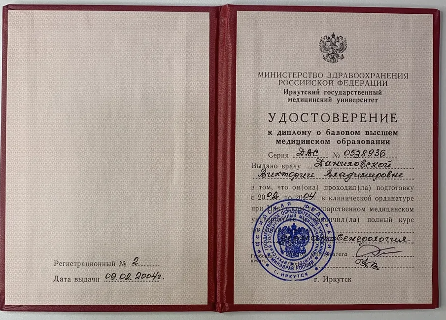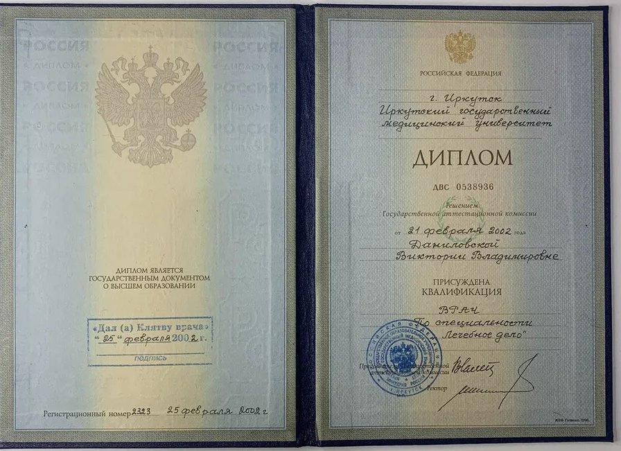 21 февраля 2002г. Закончила Иркутский Государственный Медицинский Университет, присуждена квалификация «врач» по специальности: лечебное дело