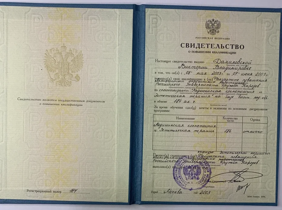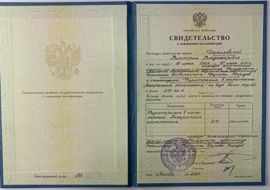2003г. В Москве в РУДН( Российский Университет дружбы народов) Прошла обучение по терапевтической и медицинской косметологии. Физиотерапия в косметологии. Аппаратная косметология.