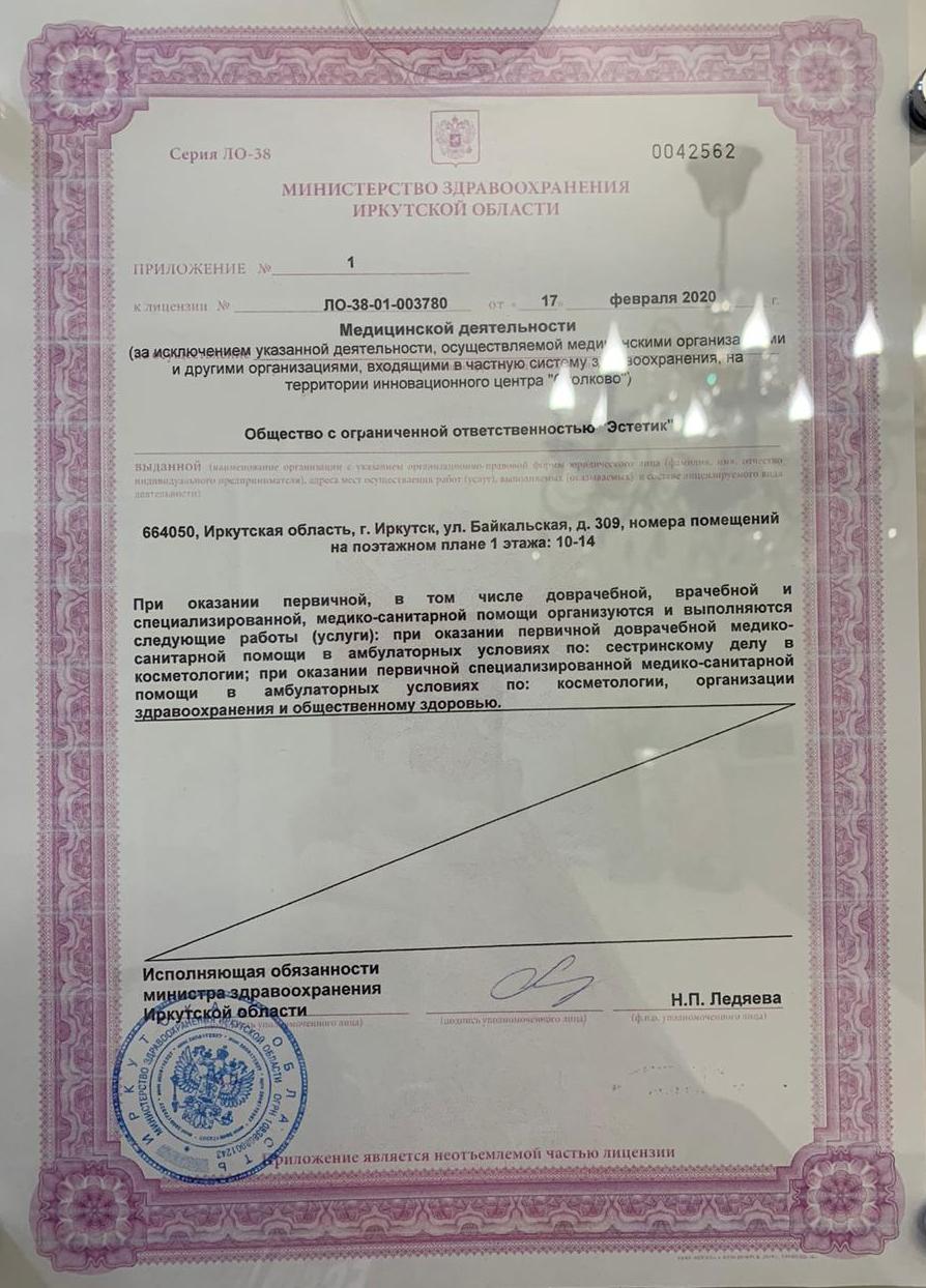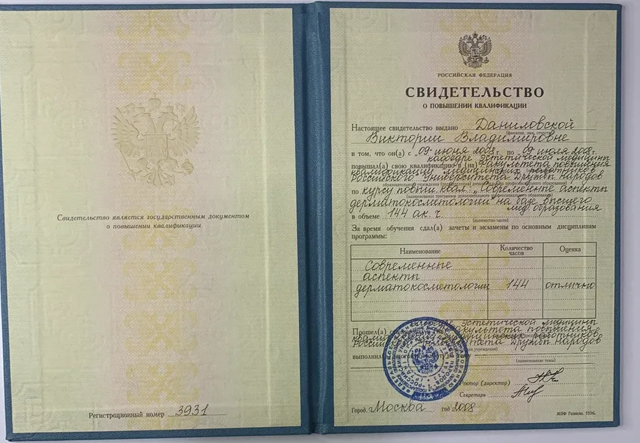 2008г. Повышение квалификации: врач-дерматолог-косметолог. Иркутский Государственный Медицинский Университет.