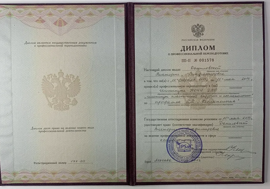 2013г. Прошла проф. переподготовку в Институте Пластической хирургии и косметологии. г.Москва.