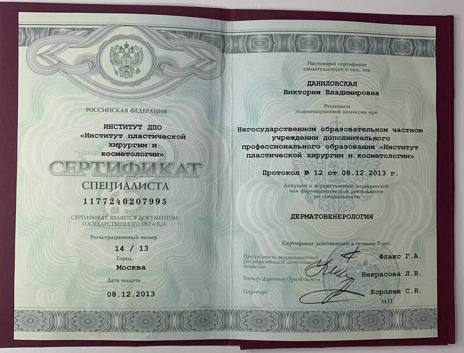 2013г. Повышение квалификации: дерматовенералогия . г.Москва . Институт пластической хирургии и косметологии Институт пластической хирургии и фундаментальной косметологии .( Дерматология)